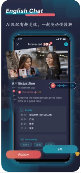 【找TA说英语】运用AI技术为你匹配真人语伴,左右滑,选择你的契合灵魂。全局翻译,直接输入英文或中文,软件自动翻译成英文,让你沟通无障碍,学习、交友一举两得。