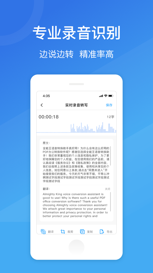 语音转文字专家苹果版是一款可以提高用户效率的实用软件,支持一边录音一边转写成文字,或上传录音文件进行文字转换,准确迅速,满足用户日常生活工作中的需求。语音转文字专家app下载后具备录音转文字、文字转语音、录音机功能,还能够进行音频格式转换和语音翻译。