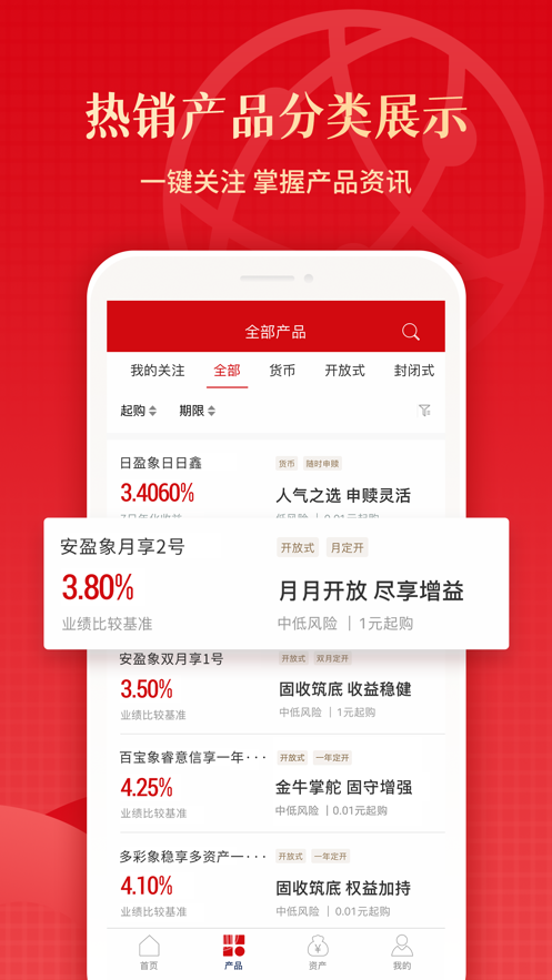 1、产品搜索,信银理财app官方下载后可以根据需要进行理财产品的快速搜索查找;