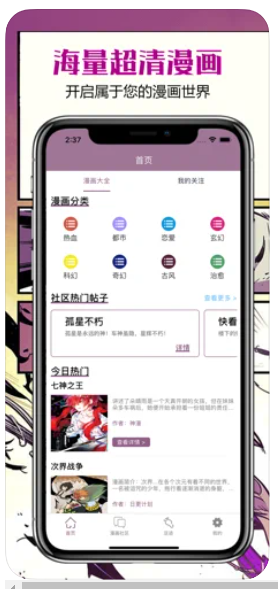 主打短篇高清全彩条漫及自媒体漫画,加载快,省流量,给你酸爽畅快的阅读感。