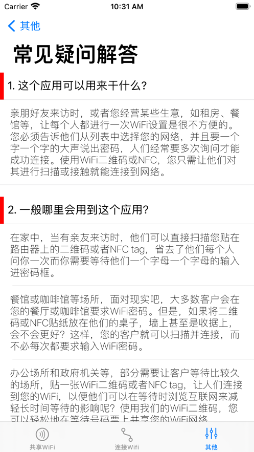 WiFi共享助手苹果版是一款十分方便的WiFi连接工具,用户在连接陌生的网络时往往需要自己手动输入密码才能够成功连接,但是WiFi共享助手app下载后只需要扫描软件内的二维码或者NFC 贴片就能够成功的连接上相应的网络,省去手打的麻烦。
