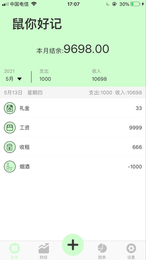 1、鼠你好记app下载后用户随时随地都能够在软件内进行分类记账,各类明细收支一目了然;