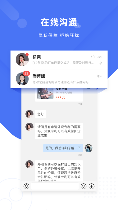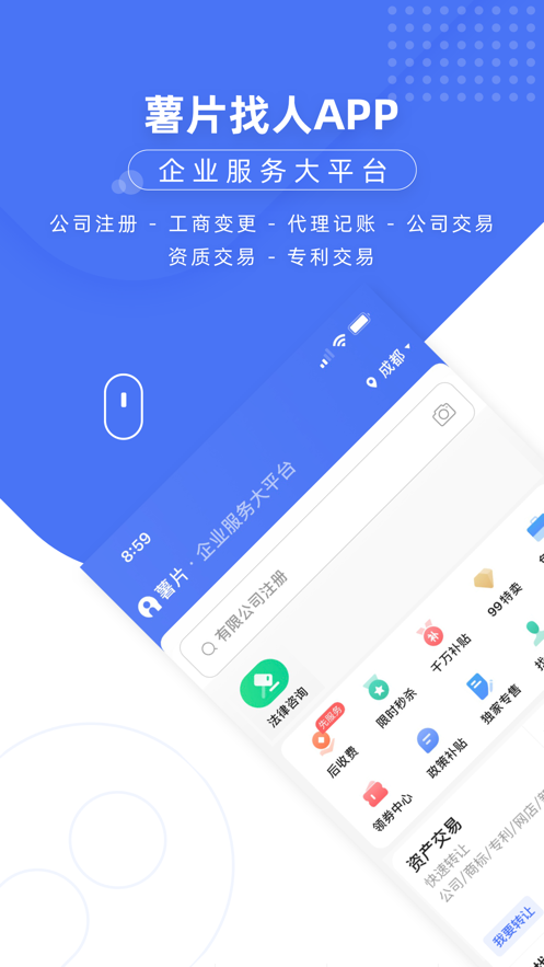 薯片找人app是一款为企业服务的软件,专门为企业和个人提供注册公司、企业税务、商标注册、专利申请等等多方面的功能,服务的内容非常丰富,可以满足众多企业的需求,并且薯片找人苹果版下载后用户直接在线就能够咨询规划师有关于企业的种种事项,办理事项更加高效专业。