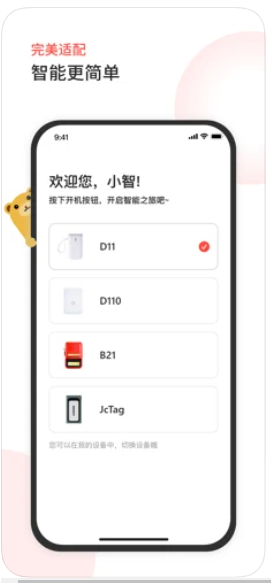 目前臣小印app支持精臣D11、D110系列、拾光机B21系列打印机,JcTag防丢器。