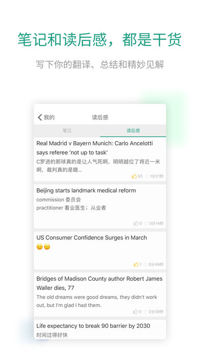 短文的每一段都可以自由添加读书笔记,你的优质读书笔记还会获得其他用户的点赞;阅读完一篇文章,在读后感区可以发布自己的评论,交流学习心得。