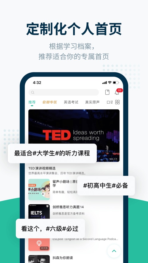 四六级,专四,专八,考研,托业,托福,雅思,高考英语,BEC,VOA,TED,商务英语... 应有尽有。