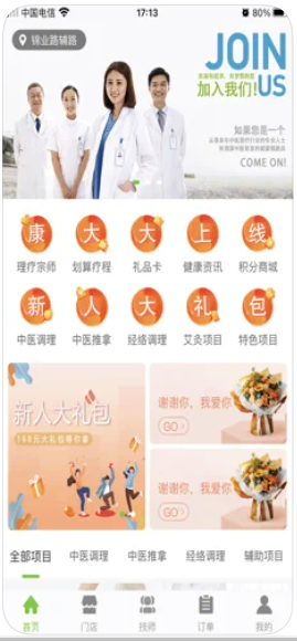 康大大用户在平台上任意选择项目、门店、技师,用户选择到店或到家到企业方式,