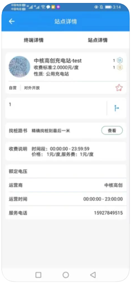 * 站点详情:查看电站计费说明、服务电话等信息,实时获取充电终端状态,了解电站周边生态。