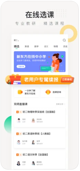 新东方在线中小学app是新东方在线旗下,新东方在线中小学网校app专为中小学生提供在线辅导课程的专属学习平台,课程覆盖中小学全科课程,包含小学、初中、高中的数学、语文、英语、物理、化学、生物等学科, 通过双师直播教学,完美还原线下学习场景,为学生提供个性化、陪伴式、智能化的在线学习产品及服务,让孩子学习更简单。