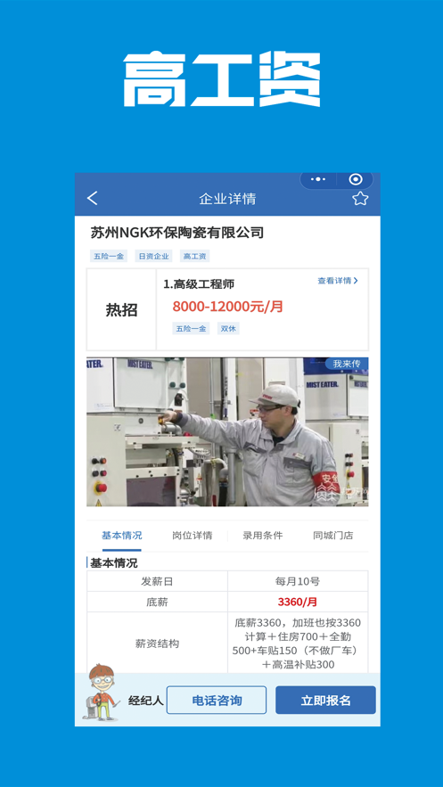 3、每个工作岗位详细的介绍了上班时间、薪资待遇、上班地点及其他有关岗位的信息。