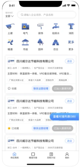 数字招采app是广联达平方科科技有限公司开发的一款专为采购企业用户提供供应商寻源的APP,通过对采购要求的匹配,推荐符合要求的供应商。通过数字招采app可以查看供应商的详细信息,并在对接后在APP上自己对供应商进行评价反馈,最终导出形成对供应商的初审表。让采购商寻源更方便、高效。