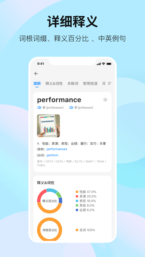 3、通过词根词缀、词组、例句、释义百分比等多种维度来提高用户记忆单词的效率。