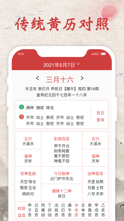 2、黄历:全面的旧黄历信息、黄历忌讳、吉日等详解,同时还附有黄历的现代解读,助您轻松掌握;