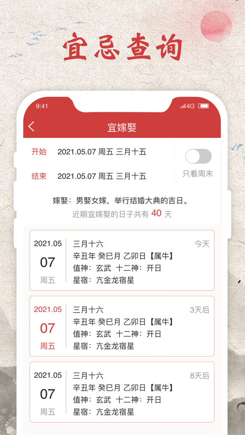相信现在还有很多的用户会通过查看日历来选择合适的日子举办重大的事件,平安万年历下载后就为用户提供了多种日历的查看方式,无论用户想查看阳历还是阴历都可以随时切换,并且平安万年历安装下载后还为用户提供了该日期的传统黄历对照,让用户能够迅速找到适合举办婚礼、搬家、开市的日子。
