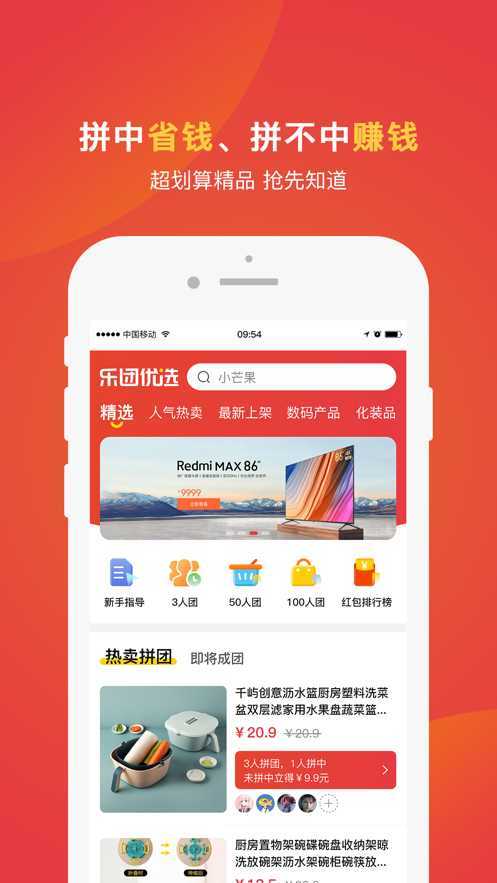 1、乐团优选app下载后用户可以自由参与到拼团之中,拼中省钱,拼不中赚钱;