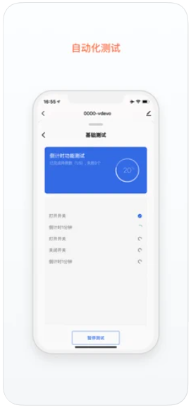 提供手动测试形式,测试人员能够更明晰的看到设备状态变化和App功用状态变化状况;相对根底测试,测试愈加全面,掩盖面更广,依据测试用例阐明,依次完成自助测试,完成测试后,能够预览测试报告。