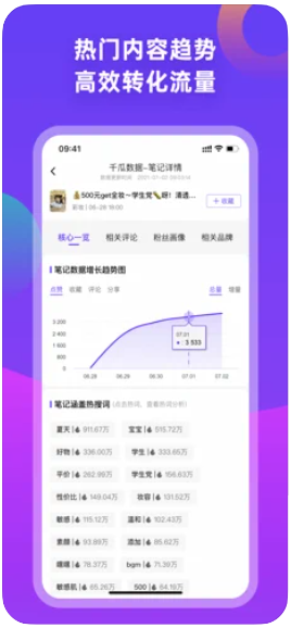 千瓜数据小红书数据分析平台是由福州西瓜文化传播有限公司开发的一款运营管理效率工具,千瓜数据APP提供全面的数据剖析、排行榜单、笔记监控、记载监测、投放管理等效劳。欢迎进行千瓜数据app下载使用。