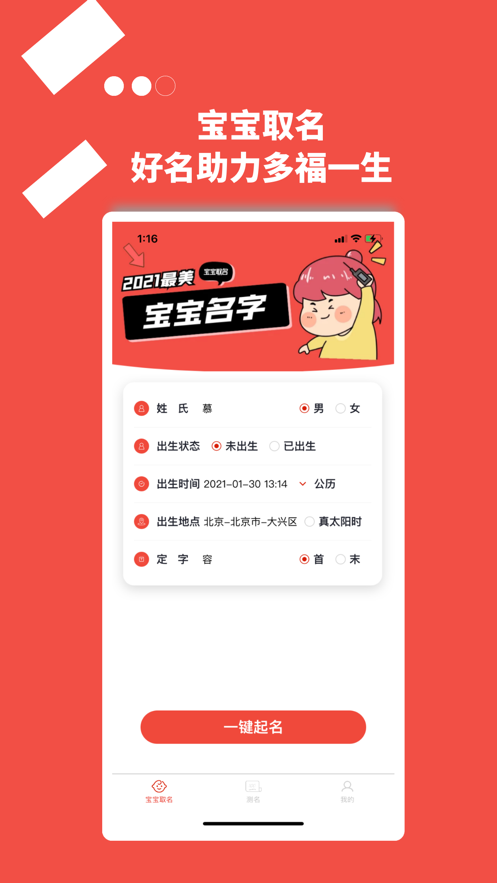 起名字测名大师苹果版是一款能够为用户起好名的软件,让家长能够为自己的孩子起一个好名字,这个名字将陪伴孩子度过一生,起名字测名大师app下载后用户直接输入姓氏、孩子的性别、出生的时间地点就能查看到海量好名,用户还能够选择指定的汉字加入到孩子的名字当中。