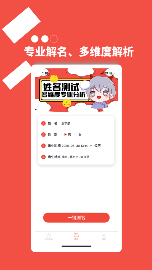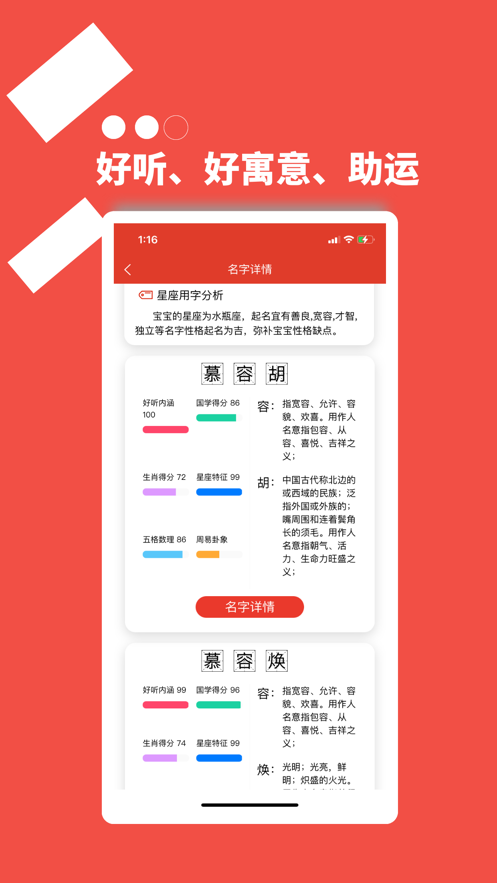 2、平台上所有的名字都综合考虑音、形、意和文化印象,对五要素进行专业命理分析;