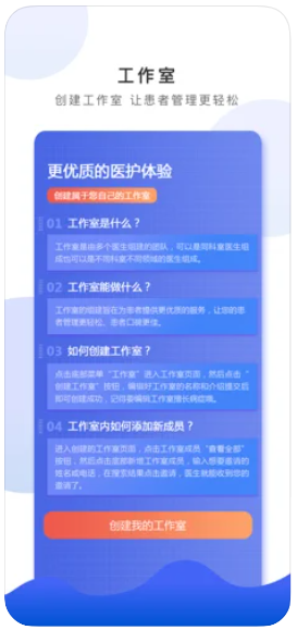 医生能够在浩医互联医生版app开通自我的工作室,添加工作室成员,进行工作室治理。