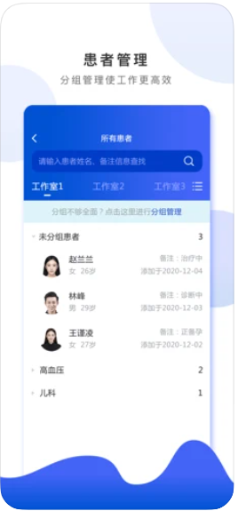 医生可对进行咨询和关注的患者进行治理,包含患者分组、患者标记、患者备注等。