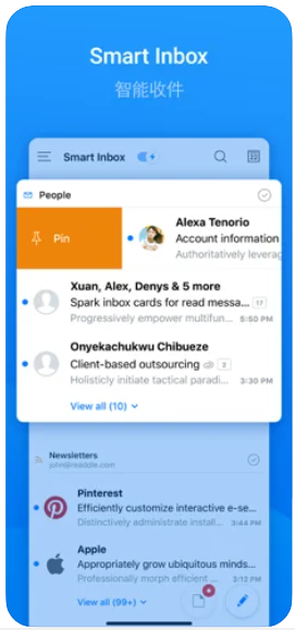 Spark邮箱客户端即系统推断为真人给你发送的邮件,它的优先度最高,罗列在最上方显示。当你使用多邮箱账户时,它分为多账户显示;当你按系统设定为 Smart Notification 时,仅仅有 Personal 类的邮件会给你推送。欢迎朋友们进行Spark邮箱下载使用。