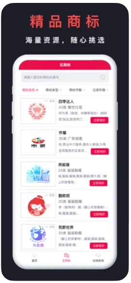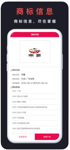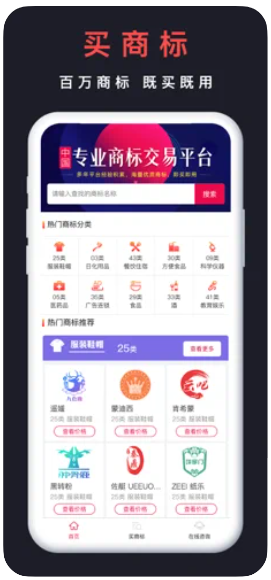 买商标app提供商标查询,商标注册,商标设计,商标申请效劳,同时进步国际商标,商标维权,商标无效,商标驳回复审,商标异议,商标转让,商标买卖,商标续展,商标变卦,商标撤销等商标业务在线咨询。