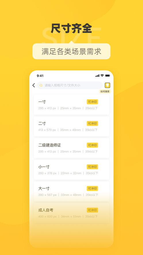 1、支持600多种证件照需求场景的拍摄,支持自定义规格,设置像素大小、分辨率等等操作;