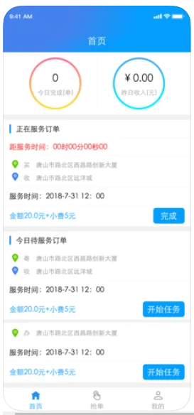 在首页展现了该跑腿人员曾经胜利抢单的订单及正在完成的任务,便当查看。