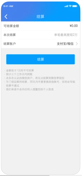 完成任务后,待系统停止清算完成后,跑腿人员可申请结算,将收入结算至微信或支付宝账户。