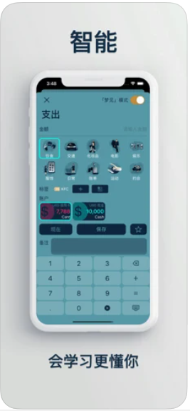 2、独创智能模式,该功效默认开启,开启后学习您记账行为的多维度数据,再次进行类似记账行为的时候会自动补全剩余维度数据。