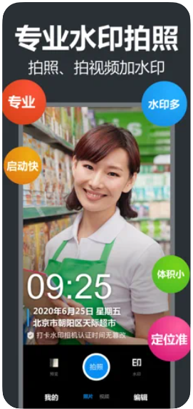 时间地点水印、建筑工程水印、考勤打卡水印、经纬度水印、物业水印、天气水印、微商水印、版权水印、二维码水印,公司品牌水印、自定义水印。