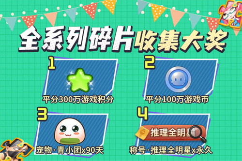 通过完成“金钥匙任务”获得“金钥匙”,参与抽奖获得“角色碎片”,每发现一张碎片,就能为你的纪念册点亮一位角色图案,集满一个系列的碎片后,即可领取纪念奖励!