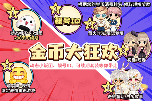 活动期间,消费金币,参加“金币消费排行榜”的角逐,领取靓号ID、超稀有服装、动态帽子:小饭团等限定好礼!