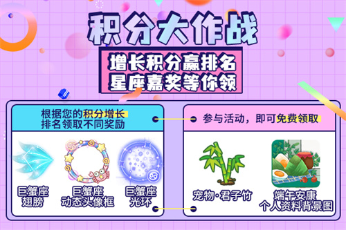 除此之外,只要您加入任意一支队伍并通过接收道具增长100游戏积分及以上,就能根据队伍之间的排名,领取“宠物·君子竹”、“个人资料背景图·端午安康”全新奖励哦!
