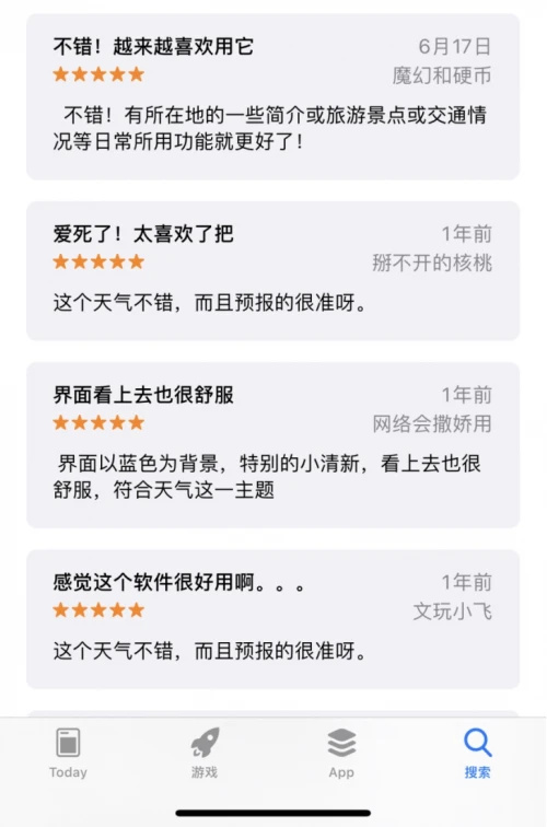 (极简主义美学,以动态气象为主视觉)再比如即刻天气,一款在各大应用商店中都有着较高推荐星级的天气预报应用。如果仔细浏览这款APP的用户评价,可以发现除了对实时降雨预报的准确性、生活贴士的人性化等常规功能的好评外,不乏有人点赞应用界面的“小清新”格调。