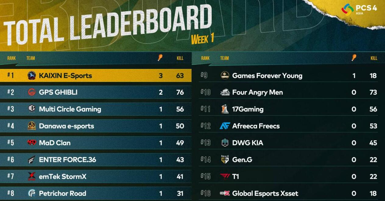 PCS4东亚洲际赛首周战罢,KX战队群星闪耀斩获周冠军