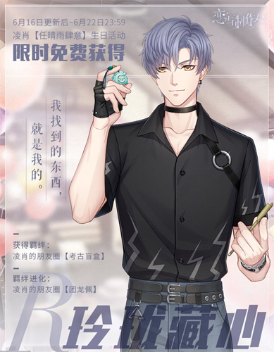 活动二阶段开启时玩家可以为凌肖挑选贴纸和刺绣贴款式,生日当天,他将保留玩家挑选的搭配和玩家见面,共度甜蜜生日。同时生日当天~6月22日进入活动界面,还可触发他的特别庆生互动剧情。吹灭蜡烛,轻唱生日歌,他将和玩家一起完成属于生日的仪式。