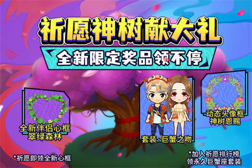 活动期间,来“祈愿神树”祈愿吧!这里有超多的礼物等着你,包含:全新伴侣心框·翠绿森林!祈愿次数越多,可领取的奖励越多!并且,活动结束后,为祈愿排行榜上前100名玩家发放额外奖励,包含祈愿金币返利、巨蟹之吻全新套装等!