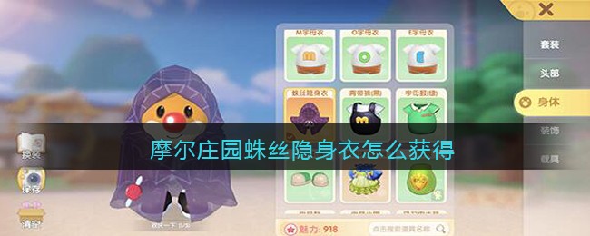 在摩尔庄园这款游戏中有着各式各样的衣服,在这些衣服中蛛丝隐身衣算是比较有趣的一件服装了,那么估计不少小伙伴都不知道该如何获取吧,下面就跟着小编一起来看看吧。