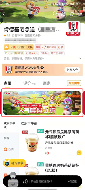 在美团、美团外卖app中找到自己附近的肯德基宅急送店铺,通过店铺活动进入摩尔庄园和KFC联动活动中,购买“摩尔庄园快乐独享餐T”、“摩尔庄园快乐分享餐T”任意一个套餐,即可成功获得拉姆袋鼠头套。