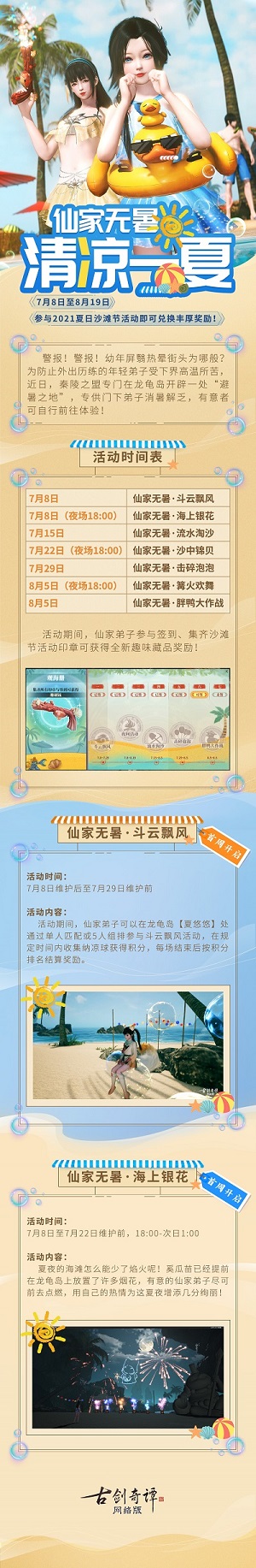 本周四(7月8日)更新维护后,2021夏日沙滩节活动即将开启!仙家无暑,清凉一夏,参与即可兑换丰厚奖励!