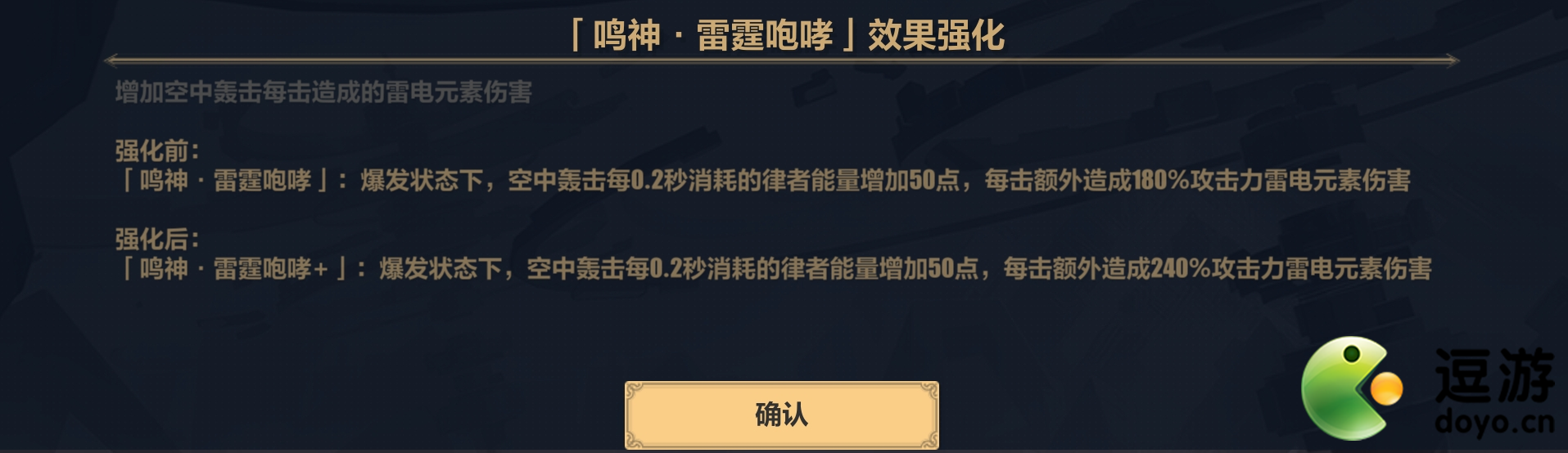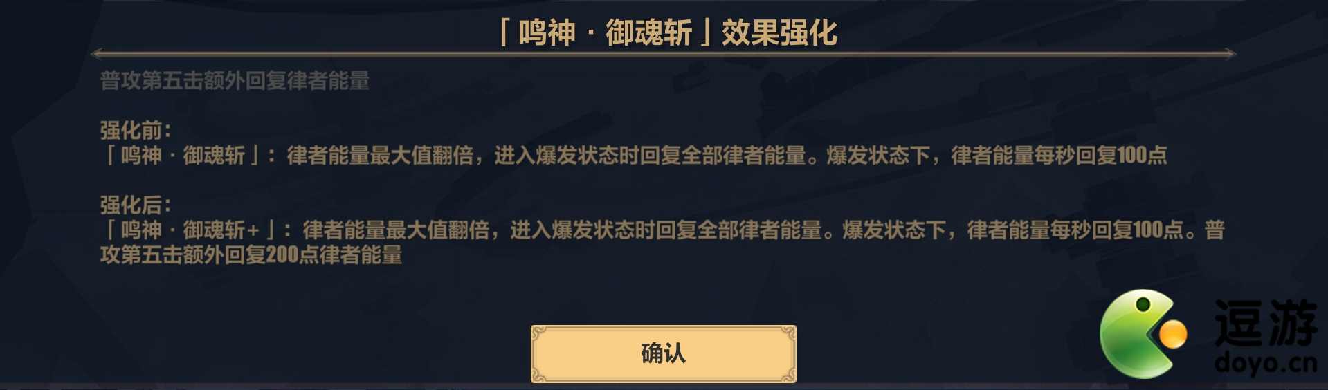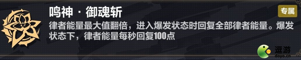 律者能量翻倍,作用不大,释放武器技能不仅不会加多出来的那个律者能量,反而会倒扣律者能量。我觉得这个技能最有用的地方就在于开大吐息可以控制怪,但是不要配合“雷霆咆哮”技能使用,不然他的控制怪作用效果就减半或完全废了。好了,上面就是两个比较没用的buff了,下面三个会是非常有用的技能