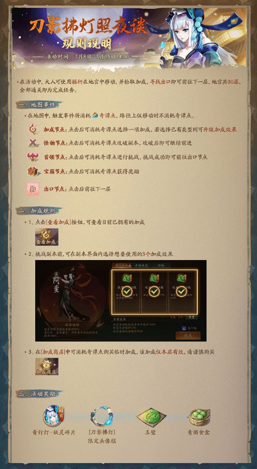 为阻止青行灯制造混乱,也为了和她建立真正的羁绊,大人们可通过7月8日维护后至7月15日期间的“刀影拂灯照夜谈”活动,挑战地宫任务,从而获取大量“青行灯”妖灵碎片、混沌洪源以及限定头像框“刀影拂灯”等奖励。