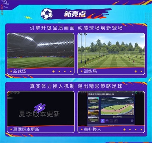 本次引擎升级带来了游戏整体画面的进一步提升,不仅添加了全新球场,以及球场各时段效果预览,而且添加了专属训练场,真实体力换人机制的引入也让玩家的游戏体验大大丰富。