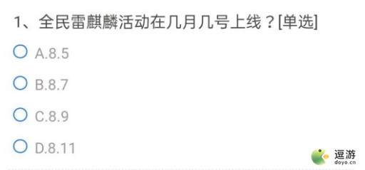 CF手游近日推出了问答活动,其中有一个问题是“全民雷麒麟活动在几月几号上线”,很多玩家还不清楚问题的答案,下面就为大家来分享一下,一起来看看吧。