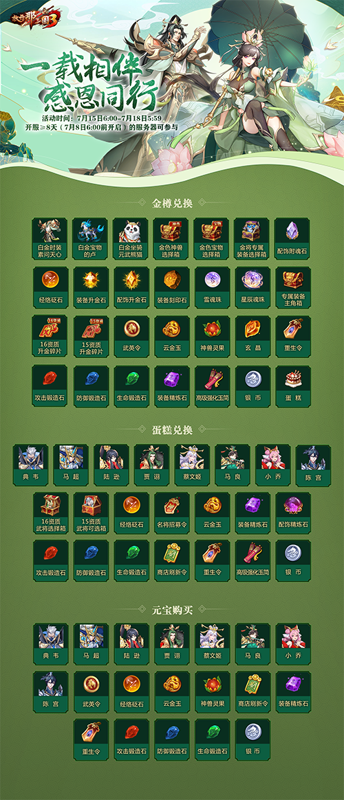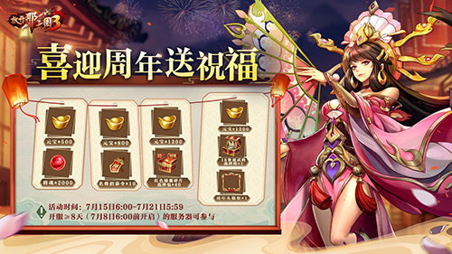 周年生日吃蛋糕,点燃烛火赠豪礼!7月15日6:00-7月21日5:59期间,玩家参与周年庆典活动,每天都可为1周年生日蛋糕点燃烛火,获得道具资源奖励及周年币。全服周年币累计达到一定数值,即可解锁福袋大礼。周年限定专属尊贵称号【感恩同行】与君同庆,更有超10000元宝及配饰升金石、金将选择箱等超稀有道具资源统统免费送!烛光长明照来时行路,灯火辉煌映可期未来!