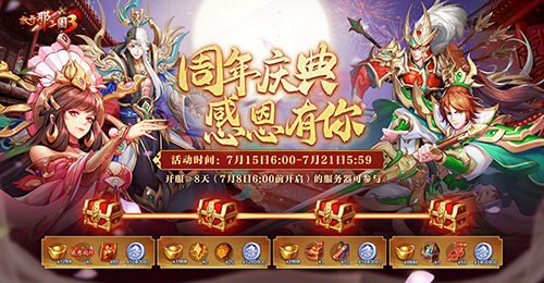 周年送好礼,蛋糕藏福利!7月15日6:00-7月30日5:59期间,主城会出现一定数目内含随机资源的蛋糕,点击蛋糕即可获得超值福利。海量元宝及培养资源满载祝福与您共庆周年!