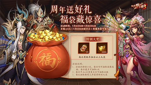 周年送福袋,好礼乐开怀!7月15日6:00-7月25日5:59期间,玩家每日均可领取福袋奖励,单日最多可领取4次。元宝及花式资源助你强化阵容愈战愈勇,更有6666元宝及名将招募20连两大惊喜福利静待有缘人的降临!