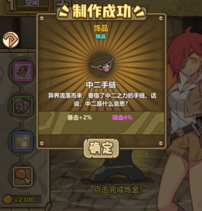 中二手链是一个饰品,可以给人物带来属性加成。中二手链是可以制作的,在中二手链的炼金术门槛之内,有概率会制作出来。